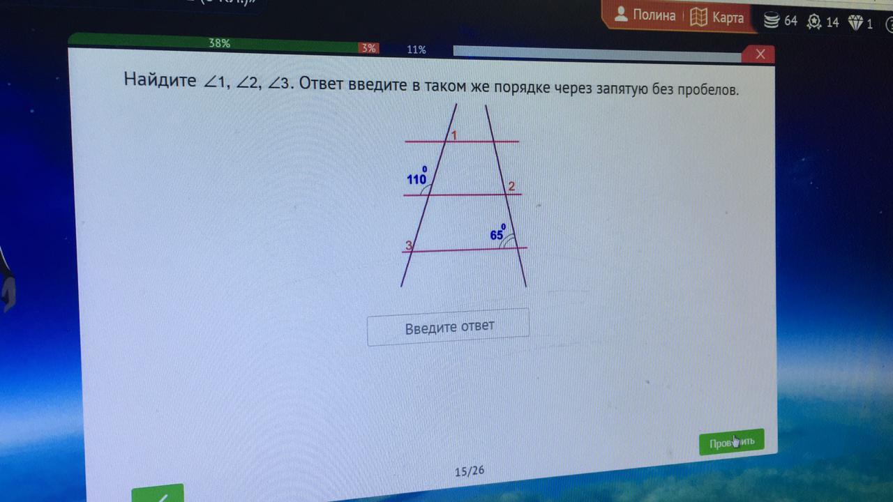 Угол 1, угол 2, угол 3. Ответ введите в таком же порядке через запятую без пробелов.