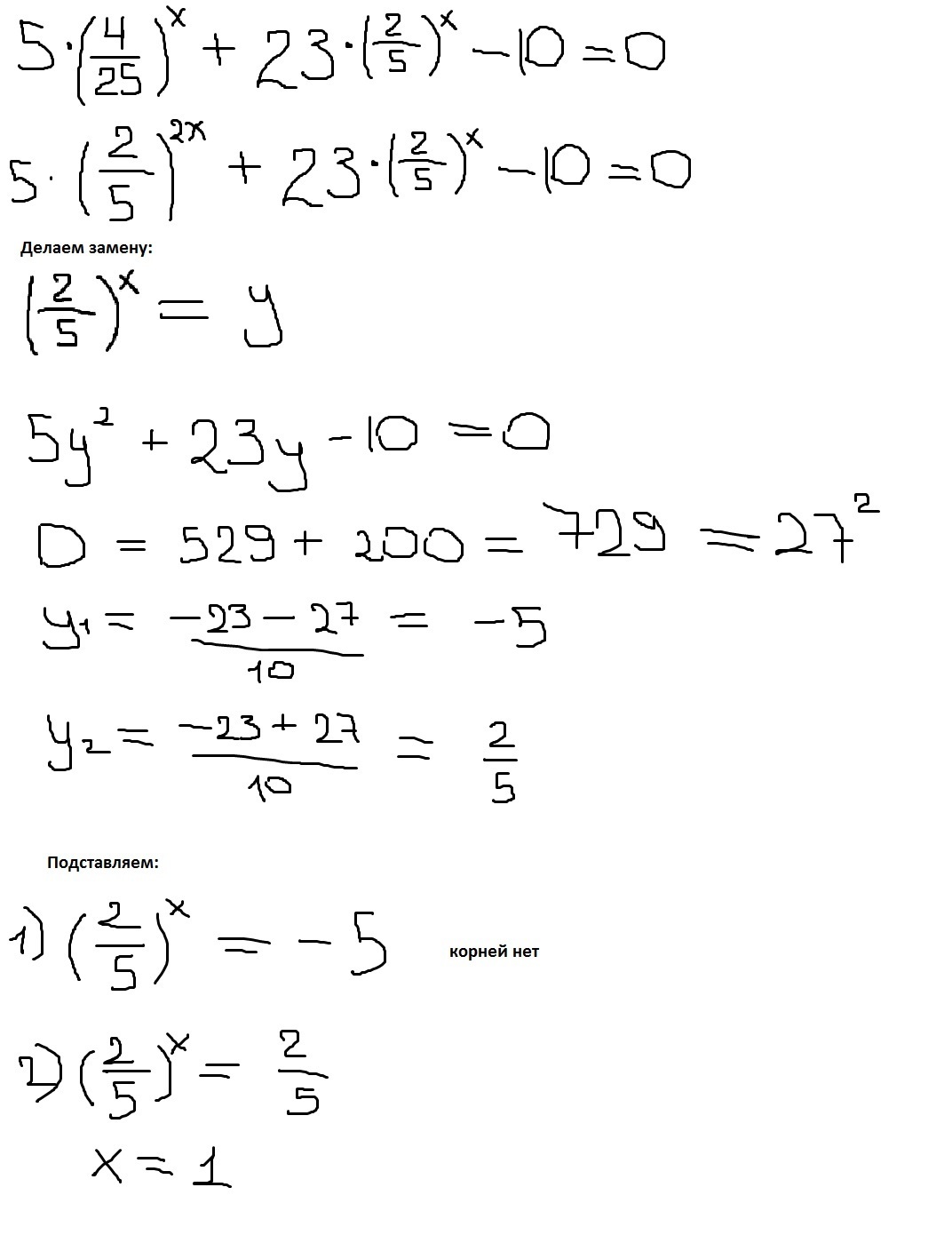 Ответ: Решением уравнеия 5*(4/25)^x+23*(2/5)^x-10=0,