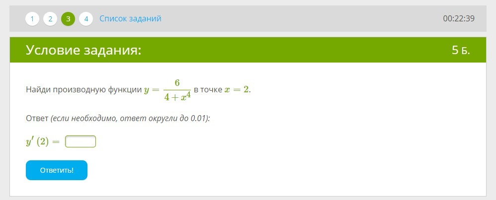 Производная равна (-24*х^3)/(х^4 + 4)^3. Подставим вместо х число 2 и получаем: