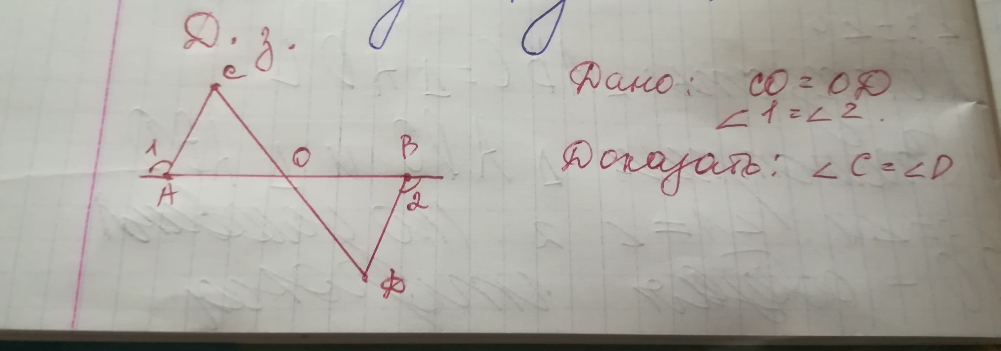 Углы OAC и OBD — это смежные углы к равным углам, поэтому они тоже равны: ∠OAC=∠OBD. Углы COA и DOB равны как вертикальные. В треугольниках ACO и OBD два угла равны, значит, равны и третьи углы (ведь сумма углов в обоих треугольниках равна 180°), что и требовалось доказать.