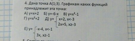 x = 1 ≥ - 1 , значит "работает" вторая строка y =3x , x =1 ⇒y =3*1 = 3 A (1 ;3) ∈ графику функции E
