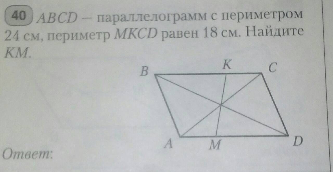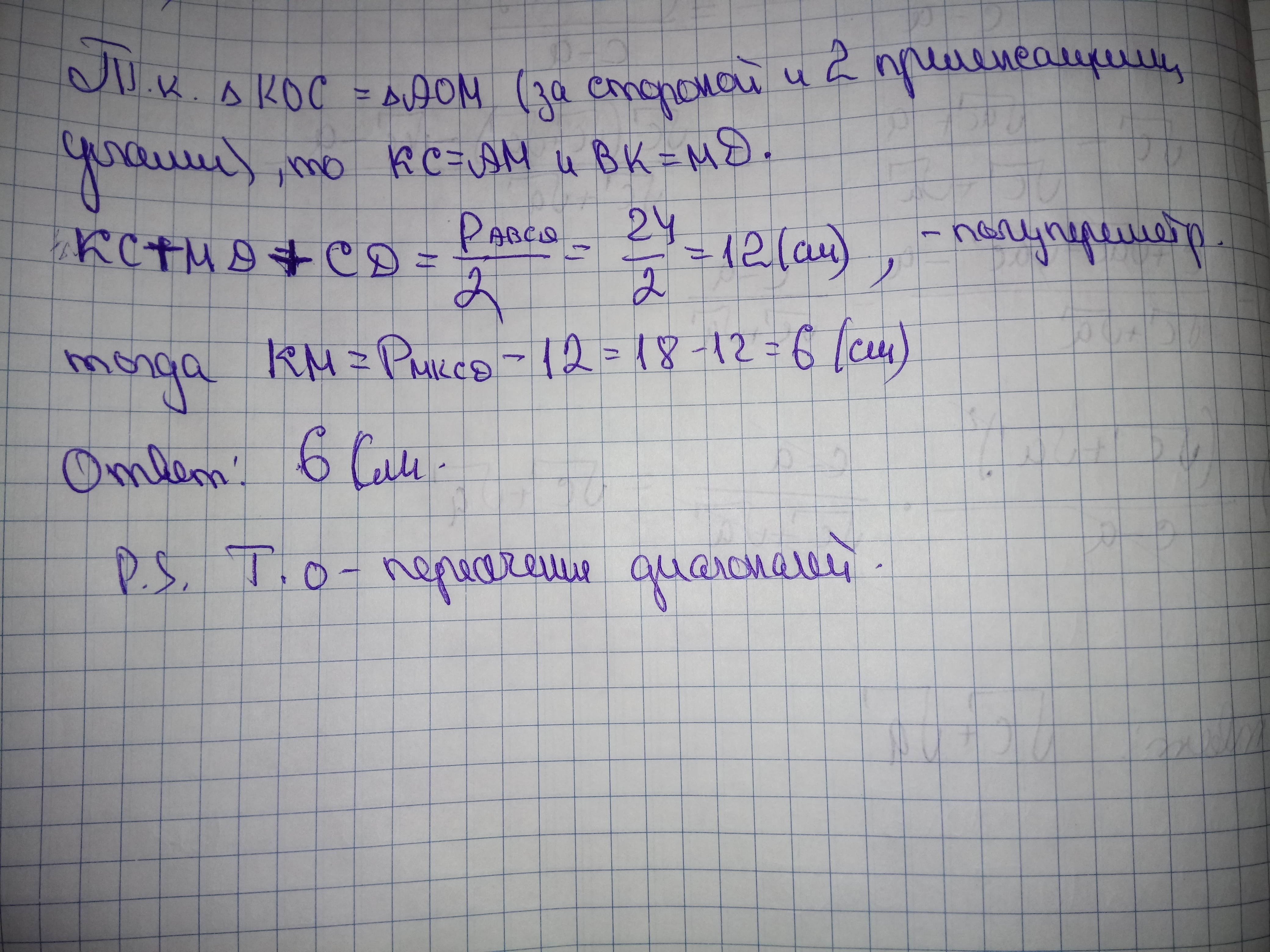 О- точка пересечения АС иВД , тр. АМО= тр.КОС .АО=ОС и накрест лежащие углы равны АМ=КС=х ВК=МД=у. АВ=СД=а. 24=2(а+у+х) или а+у+х=12 , 18=х+у+а+МК, МК=18-12=6