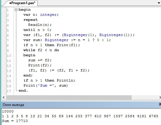 Ввести натуральное число N и вычислить сумму всех чисел Фибоначчи, меньших N. Предусмотрите защиту от ввода отрицательного числа N.