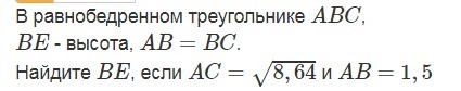 ВЕ^2 = 1,5^2 - (корень (8,64)/2) ^2= 2,25 - 2,16 = 0,09