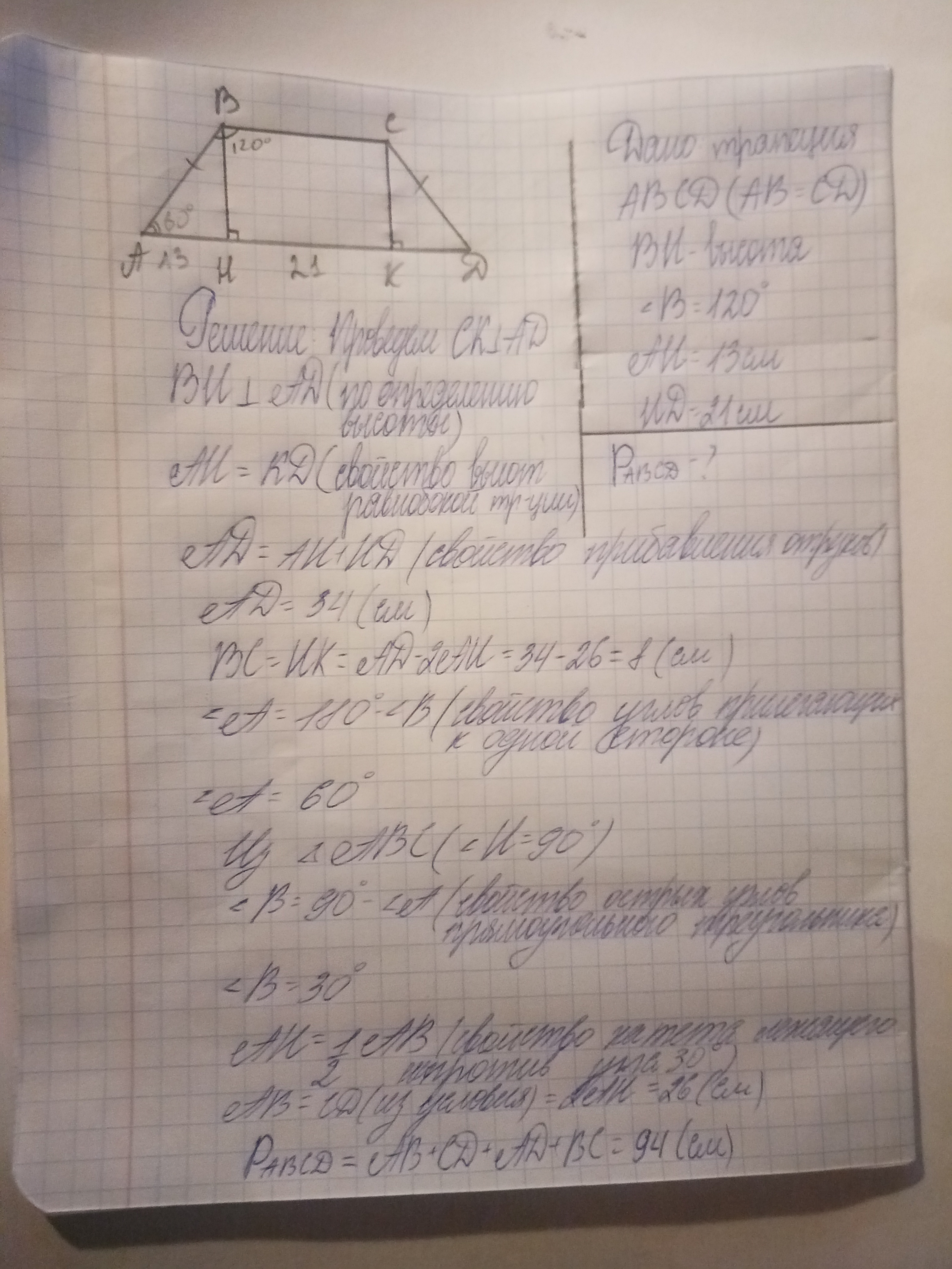 .В равнобокой трапеции высота проведенная. Из вершины тупого угла,равного 120° делит основание на отрезки 13 и 21 см. Найдите периметр трапеции