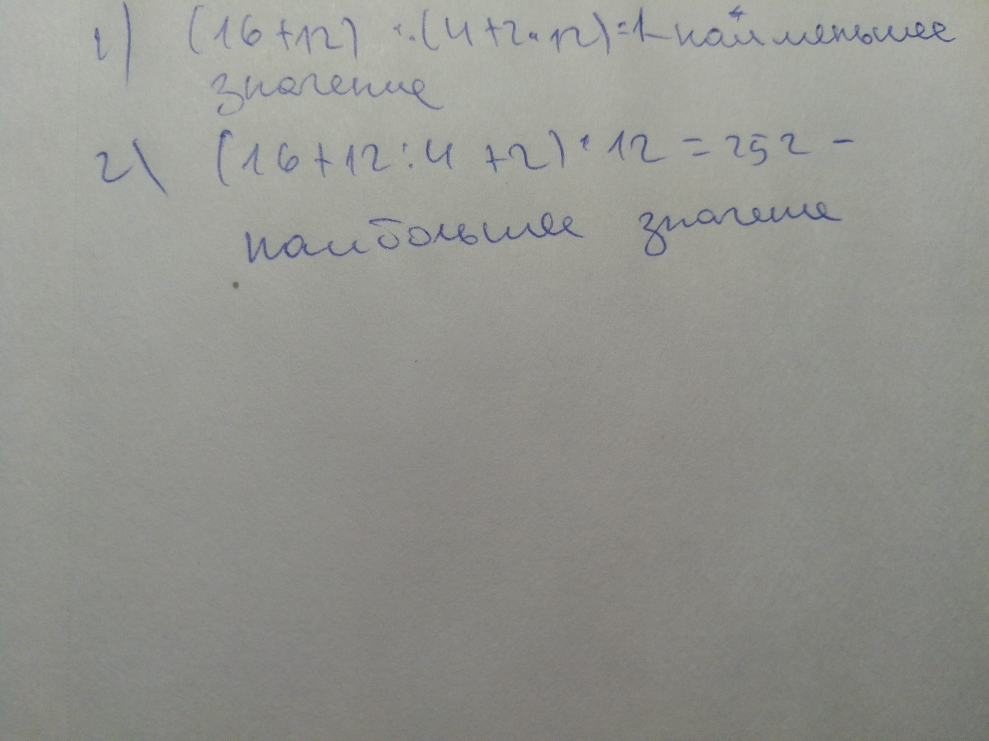 В записи числа 16+12:4+2*12 расставьте скобки так, чтобы получилось: а) наименьшее возможное число; б) наибольшее возможное число.