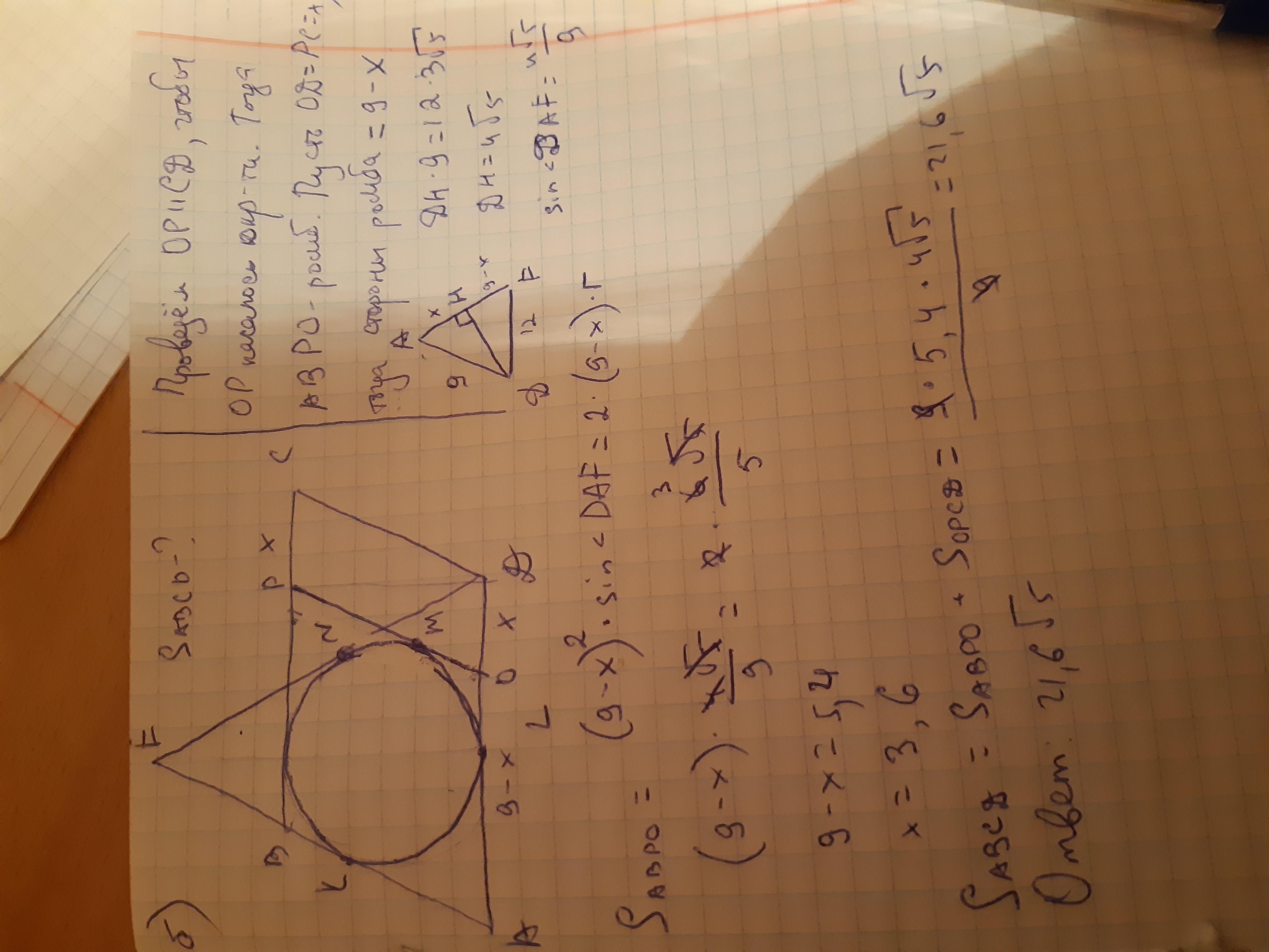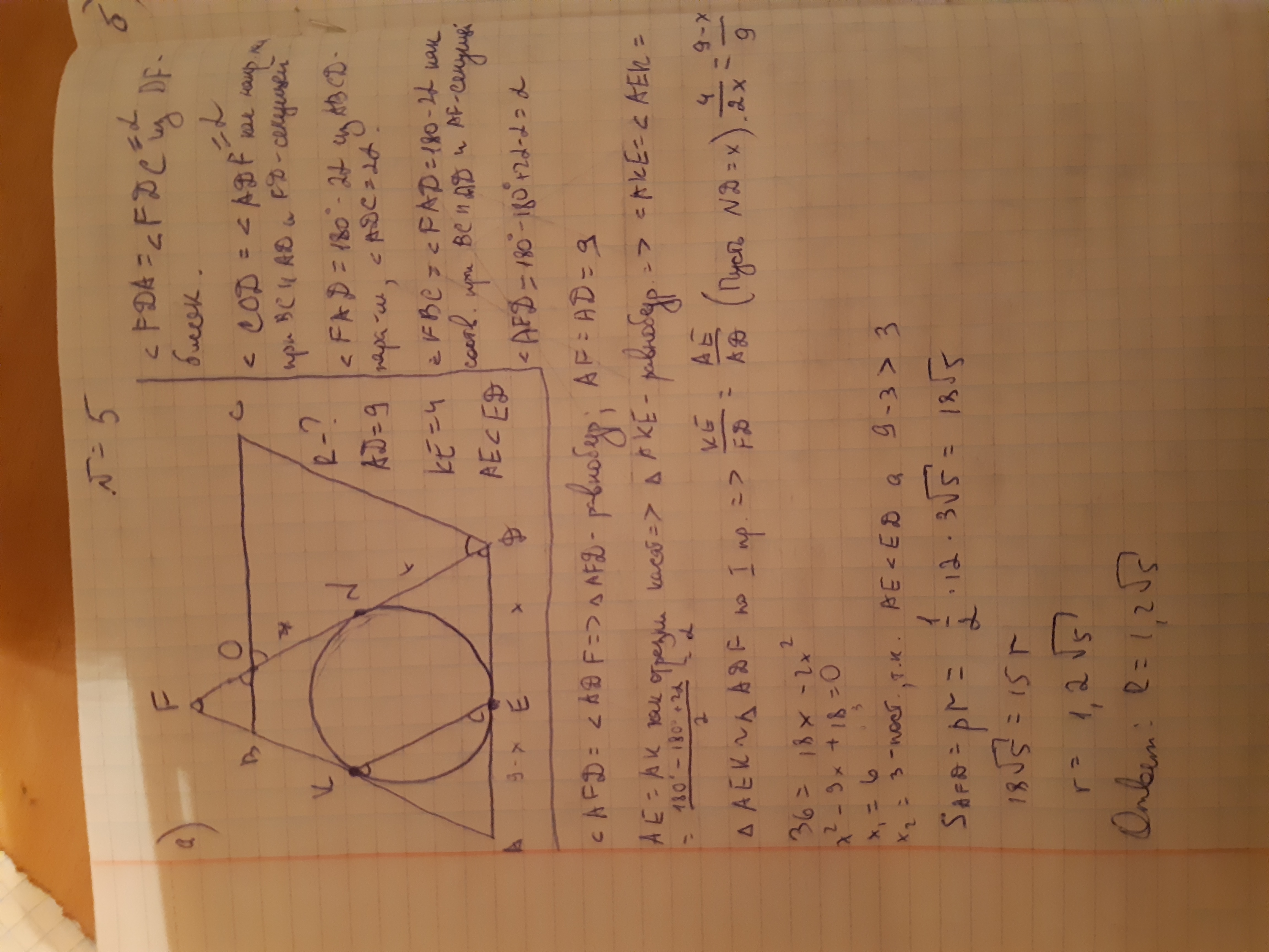 Смотрим на равенство углов, замечаем равнобедренные треугольники. Обозначим nd за икс, n - середина fd. Из подобия составляем уравнение и находим икс. Оттуда радиус через формулу площади ничего сложного. Второй пункт на фото. Удачи в зфтш)