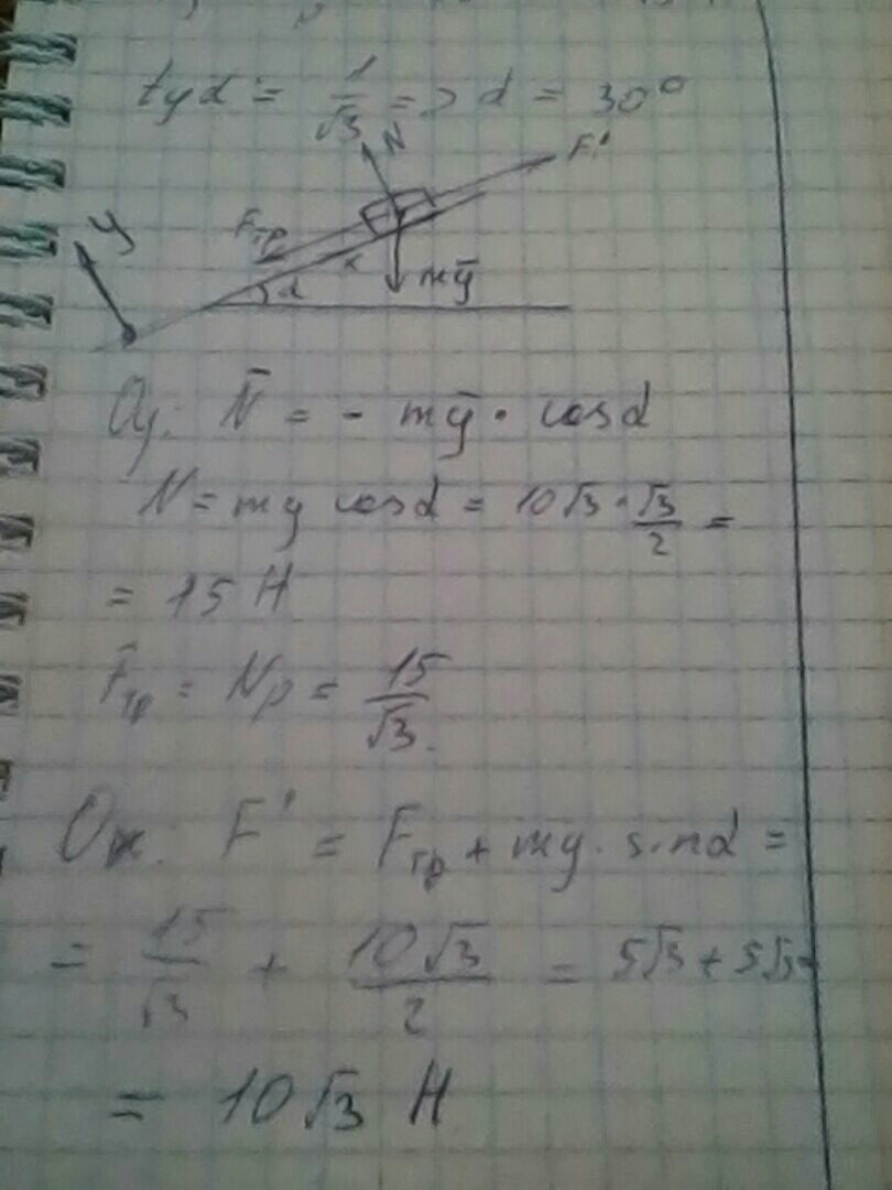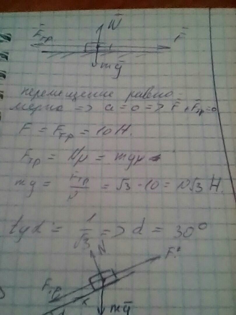 Некоторый груз равномерно перемещают по шероховатой горизонтальной поверхности,приложив к нему силу F1=10 Н. Какую силу F2 необходимо приложить к грузу, чтобы перемещать его равномерно вверх по той же поверхности, расположенной под углом а е горизонту, если tg a=коэффициенту трения скольжения между грузом и поверхностью=1/√3?