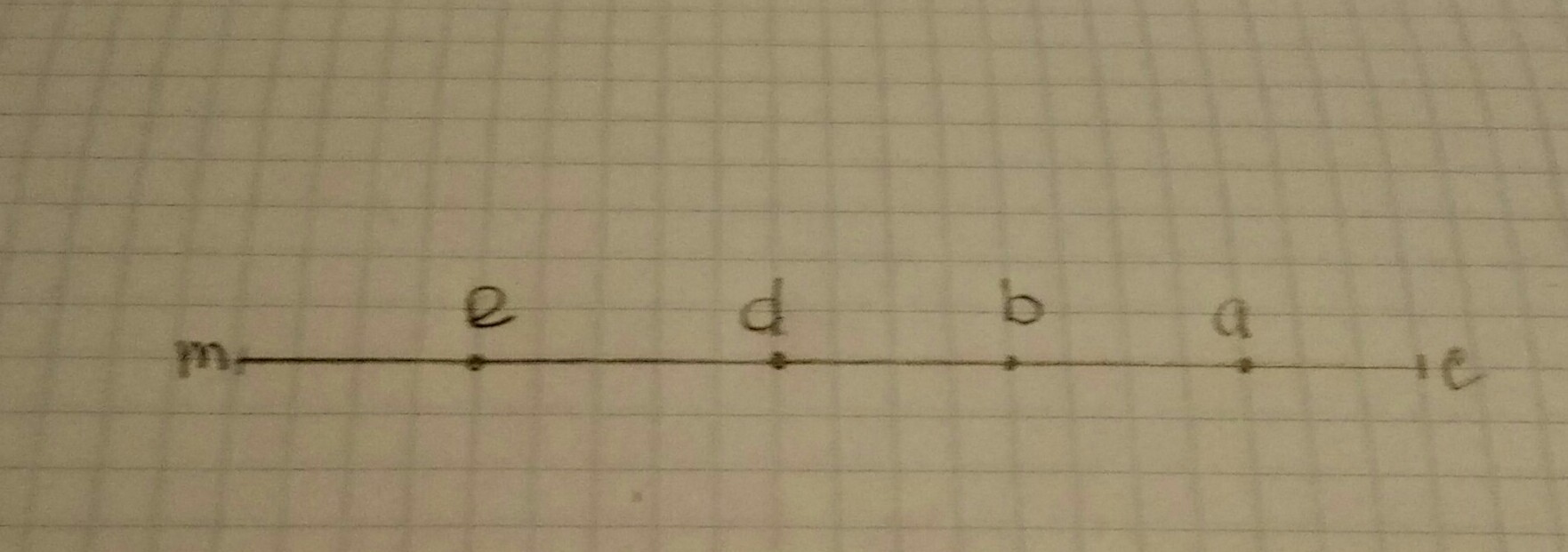 отметьте в тетради точки m и c.С помощью линейки постройте отрезок mc. отметьте на этом отрезке точки a,b,d и e так,что бы точка a лежала между точками m и c точка b между m и a точка d лежала бы между точками m и b и,наконец точка e между точками m и d