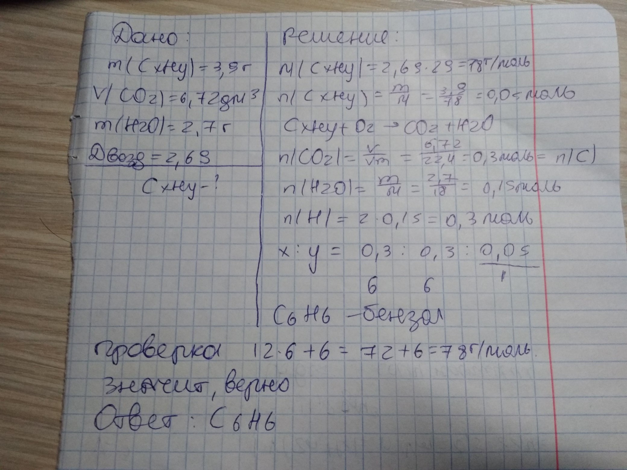 Під час спалювання органічної сполуки масою 3,9 г утворилося 6,72 л вуглекислого газу так 2,7 води. Визначте формулу сполуки , якщо густина її парів за повітрям 2,69