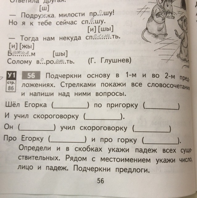 Шёл(сказуемое) Егорка(подлежащее,И.п.)) по пригорку(Д.п.) и учил(сказуемое) скороговорку(В.п.) . Он(подлежащее,3 лицо,ед.ч,И.п.) учил(сказуемое) скороговорку(В.п.) про Егорку(В.п.) и про горку(В.п.)...Словосочетания: Шёл (по чему?) по пригорку, учил (что?) скороговорку, скороговорку (про кого?) про Егорку, скороговорку (про что?) про горку.