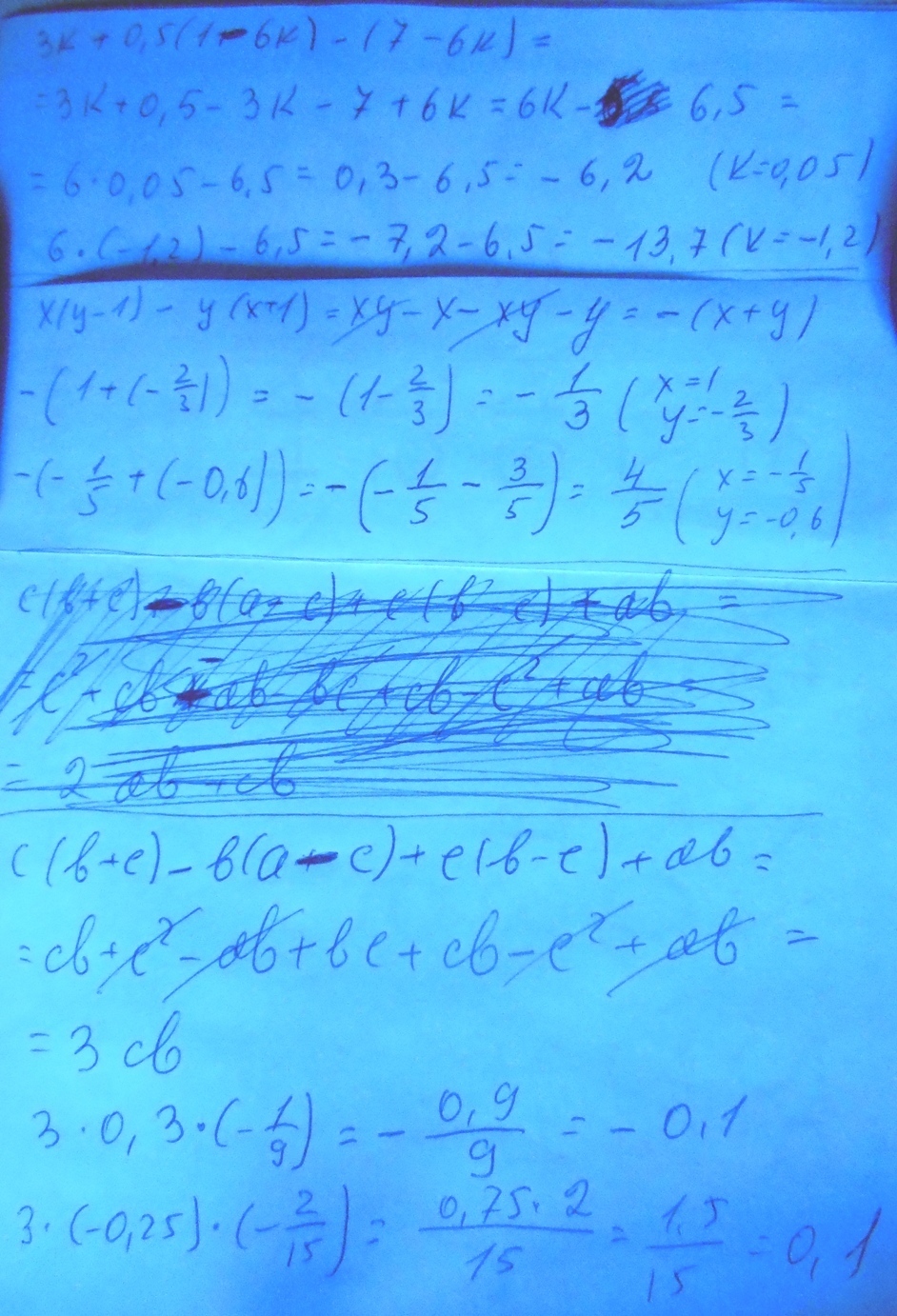 Найдите значение выражения : а) 3k + 0,5 (1-6k) - (7-6k) при k = 0,05 ; k = -1,2 ;