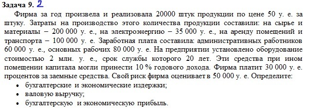 Сначала определяются бухгалтерские издержки: 200 000 + 35 000 + 100 000 + 60 000 + 80 000 + 2 000 000/20 + 30 000 = 605 000 у. е. Затем надо подсчитать экономические издержки: 605 000 + 2 000 000*0,1 + 50 000 = 855 000 у. е.