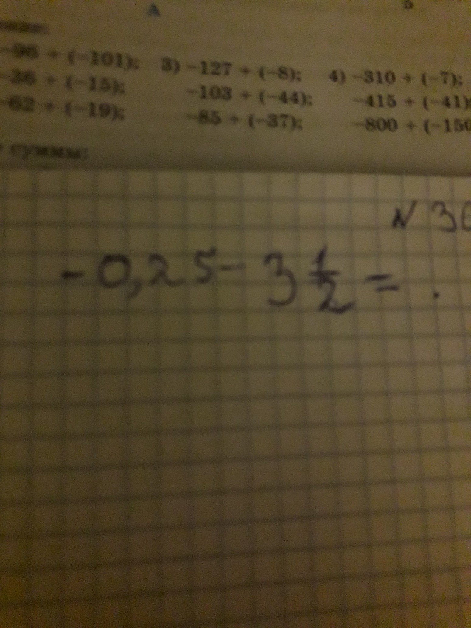 -0.25 - 3 1/2 = -0.25 - 3.5 = - ( 0.25 + 3.50) = -3.75 или -3 3/4