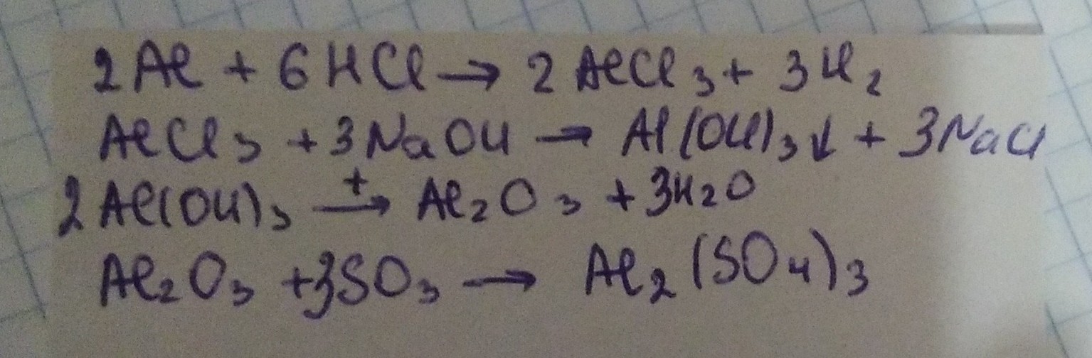 напишите уравнения всех реакций,с помощью которых можно осуществить следующие превращения:алюминий-хлорид алюминия-гидроксид алюминия-оксид алюминия-сульфат алюминия