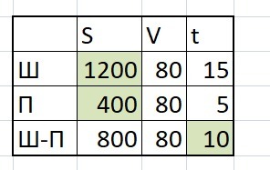 1. S(ш-п) = Sш- Sп = 1200 - 400 = 800 м - разность в расстояниях