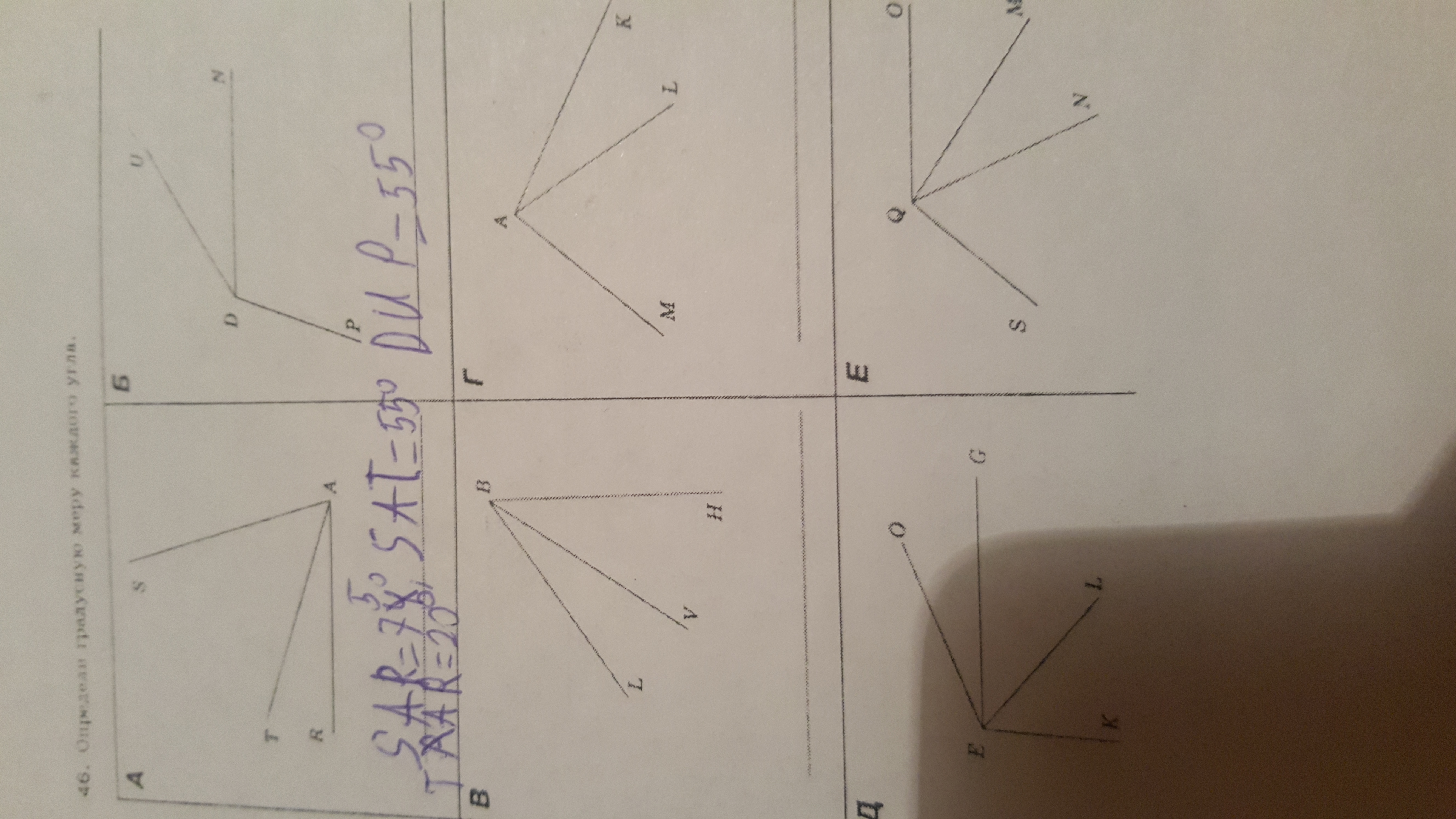 Для этого нужен транспортир ты его должна взять и там одна маленькая дырочка эту дырку ты должна приложить к углу и от нуля смотришь до линии и отмечаешь градус