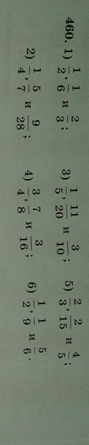 6) 1/2, 1/9, 5/6; наименьший общий знаменатель --- 18, значит: 9/18, 2/18, 15/18