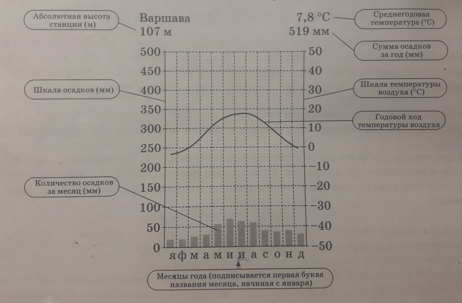 С помощью этой диаграммы можно определить среднегодовую температуру,среднюю температуру за любой месяц,годовое количество осадков,количество осадков за месяц в городе Варшава.