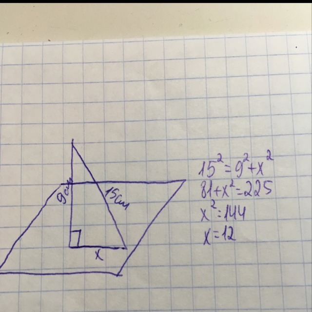 Задача по геометрии. Точка A находится на расстоянии 9см от плоскости a(альфа). Длина наклонной, проведенной из точки А к плоскости, 15см. Найдите длину проекции наклонной на плоскость. Как можно подробнее пожалуйста