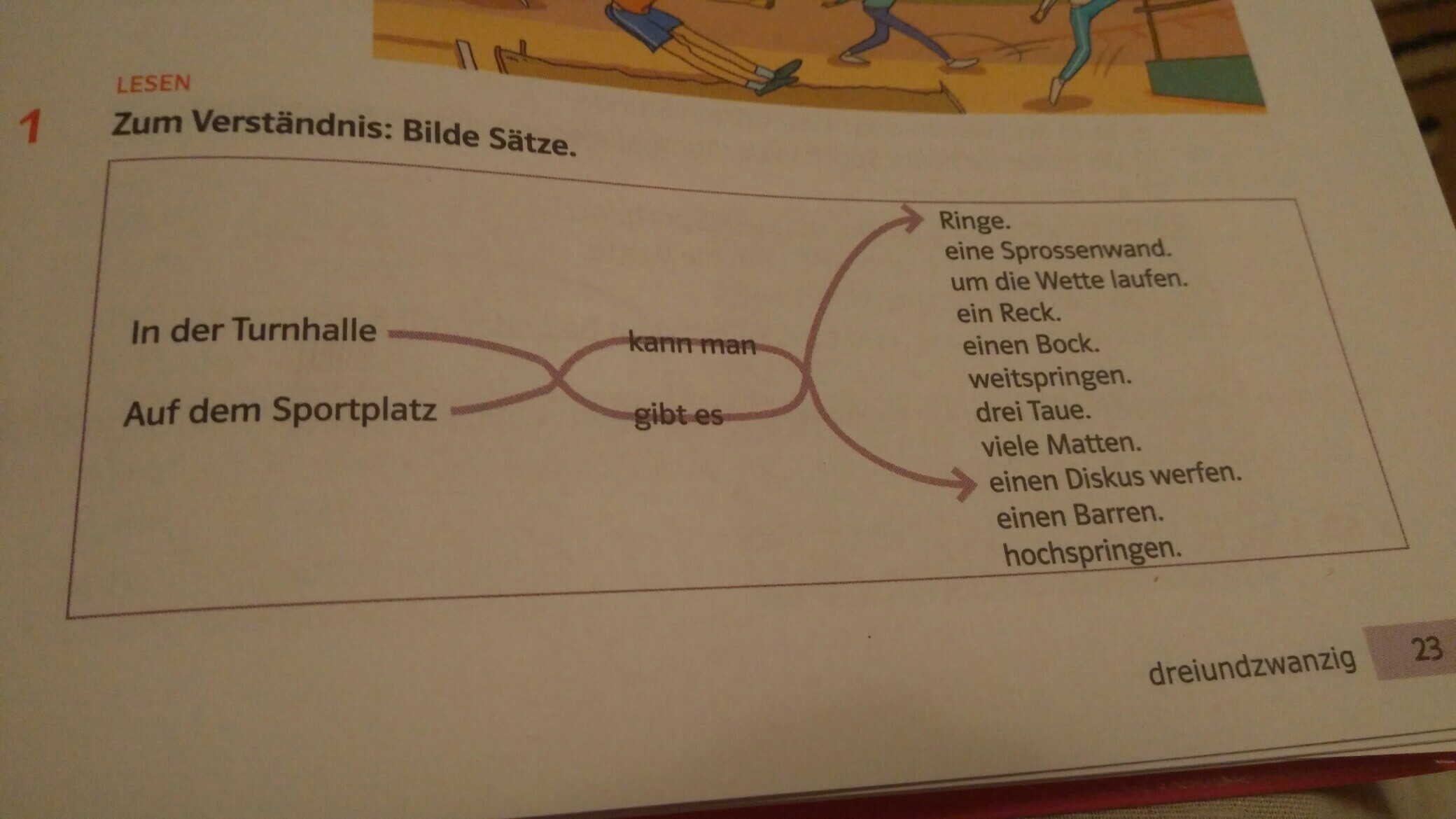 1. In der Turnhalle gibt es Ringe, eine Sprossenwand, einen Bock, drei Taue, viele Matten, einen Barren, ein Reck.