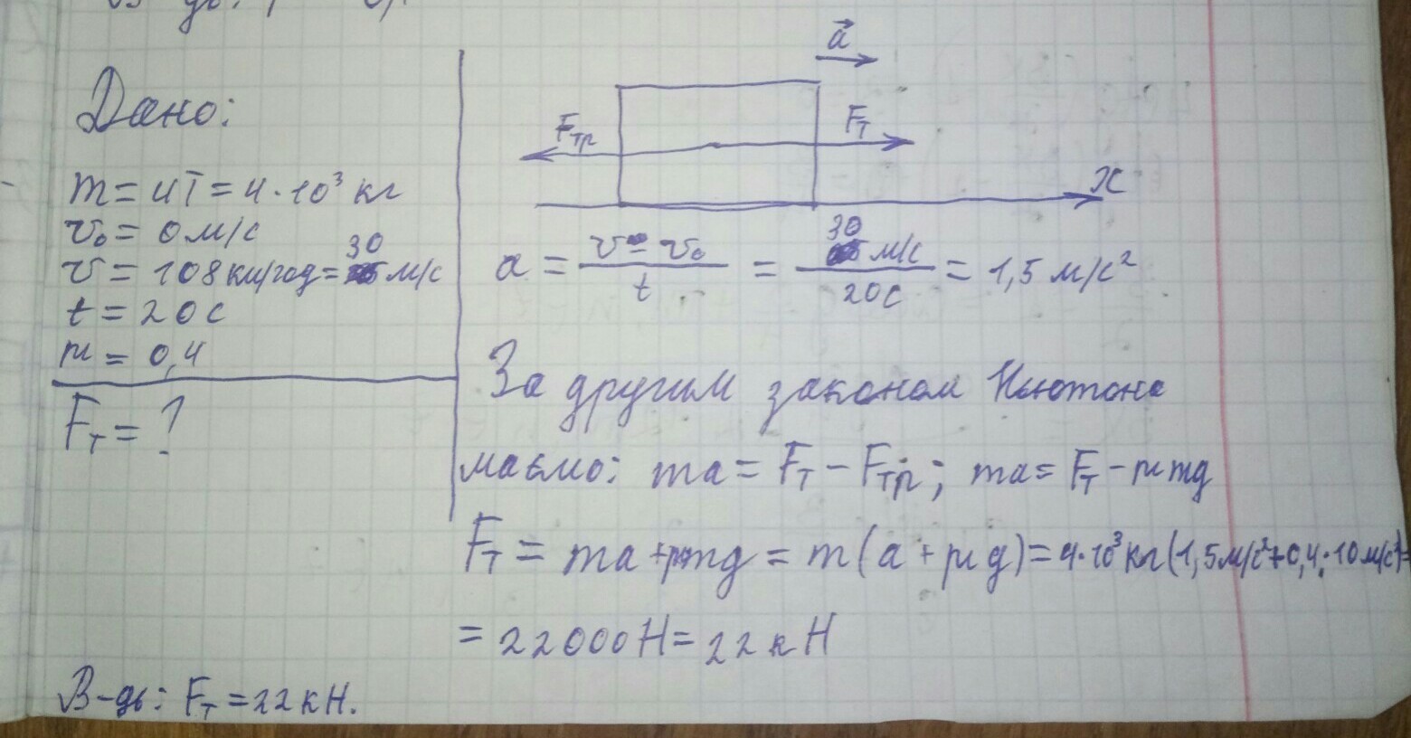 Автомобіль масою 4 т, рушаючи з місця, досягає швидкості 108 км/год за 20с. Знайти силу тяги , якщо коефіцієнт опору руху = 0,4.