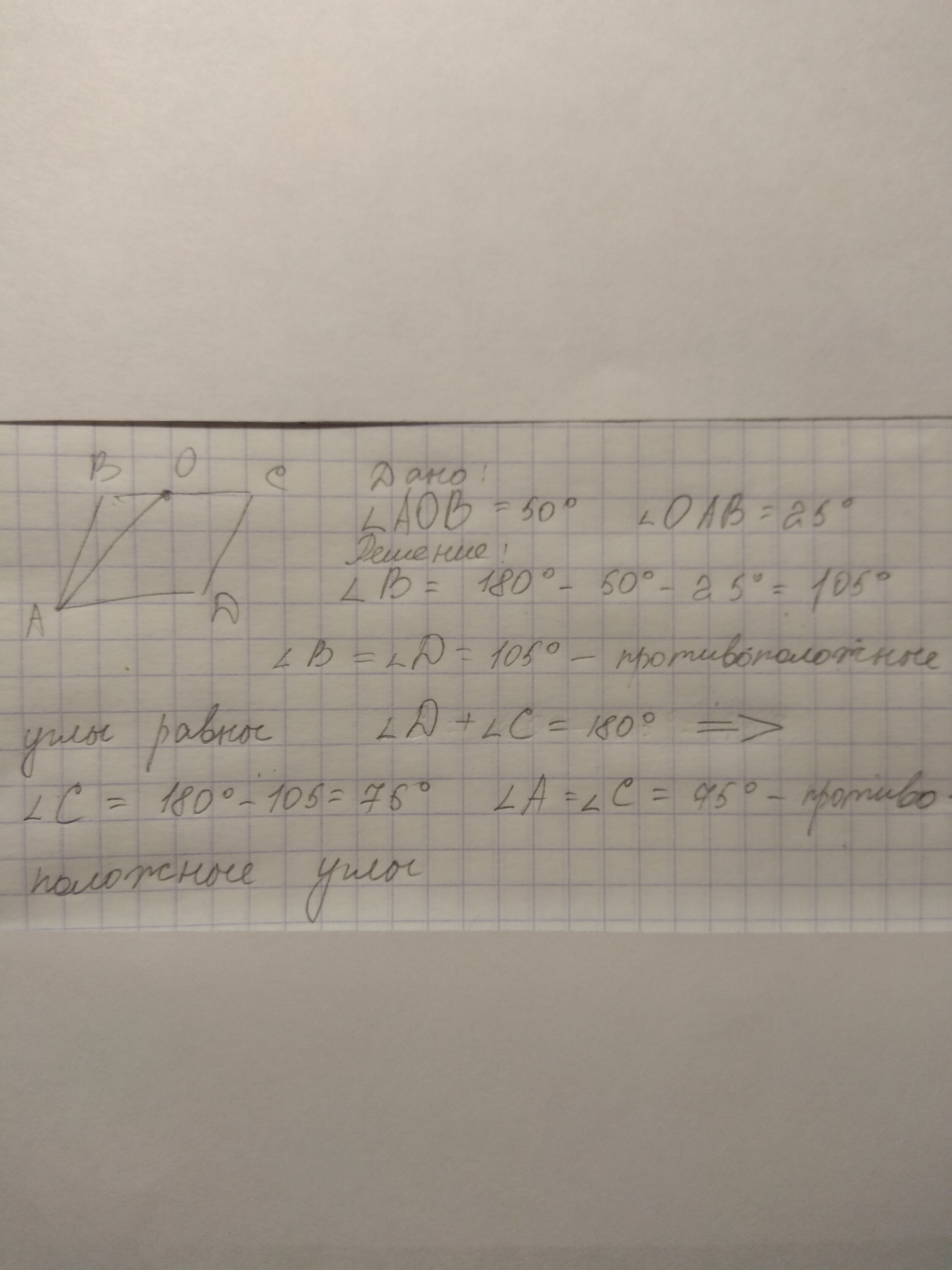 Дано: ABCD-параллелограмм. О- точка пересечения. угол OAB=25 градусам угол AOB=50 градусам. Найти углы параллелограммма