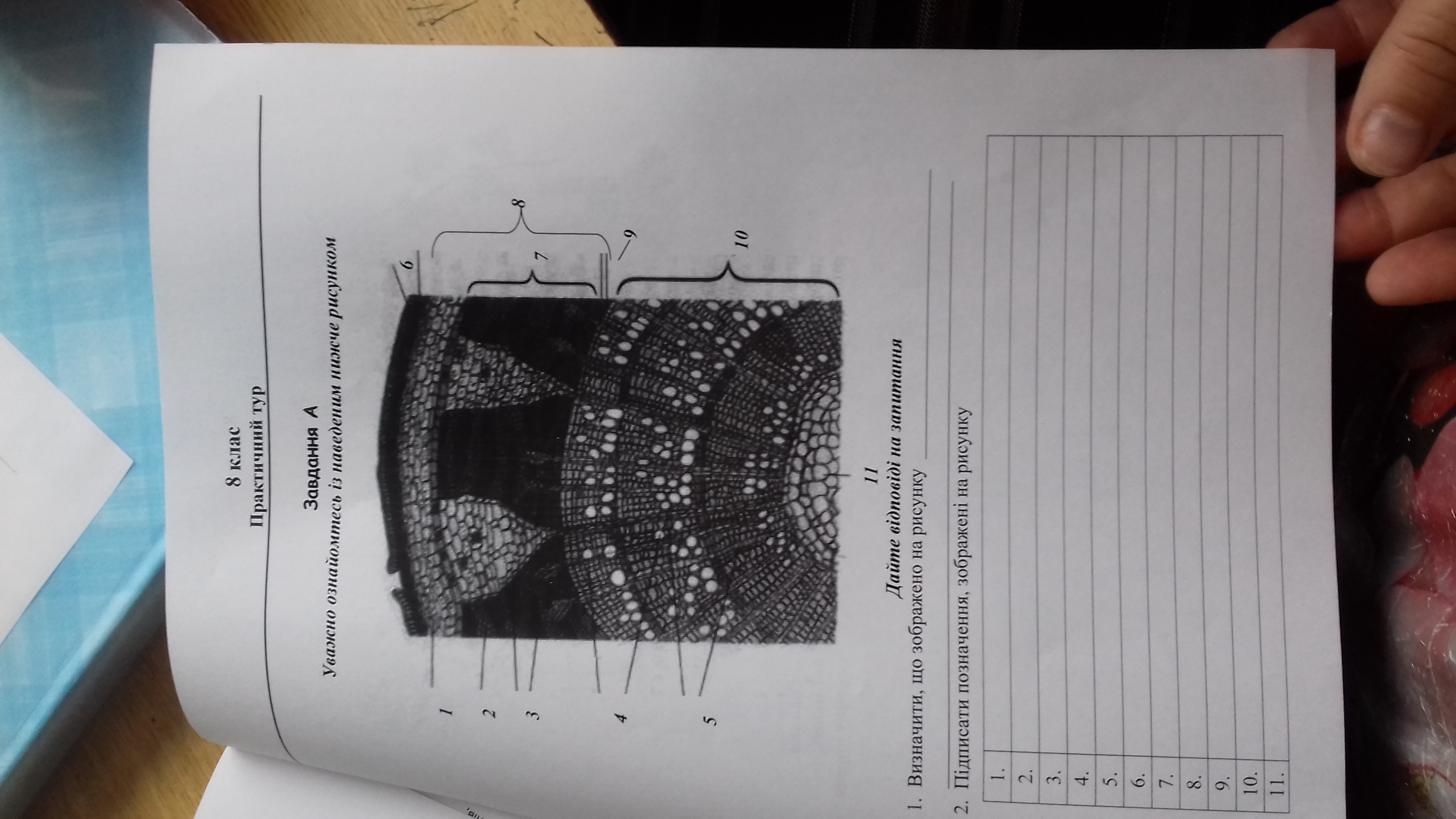 11-сердцевина, 10-древесина, 9-камбий, 8-кора, 1- клетки первичной коры и др.