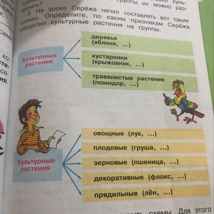 1. Культурные растения-Деревья (Яблоня, груша, абрикос). Кустарники-(Крыжовник, малина, смородина). Травянистые растения-(Помидоры, огурцы, редиска, лук). 2.Овощные-(лук, чеснок, редька, огурцы, морковь). Плодовые-(груша, черешня, слива). Зерновые-(Пшеница, овёс, гречка, рож). Декоративные-(Флокс, кактус, герань, алоэ). Прядильные-(Лён, джут, кенаф).