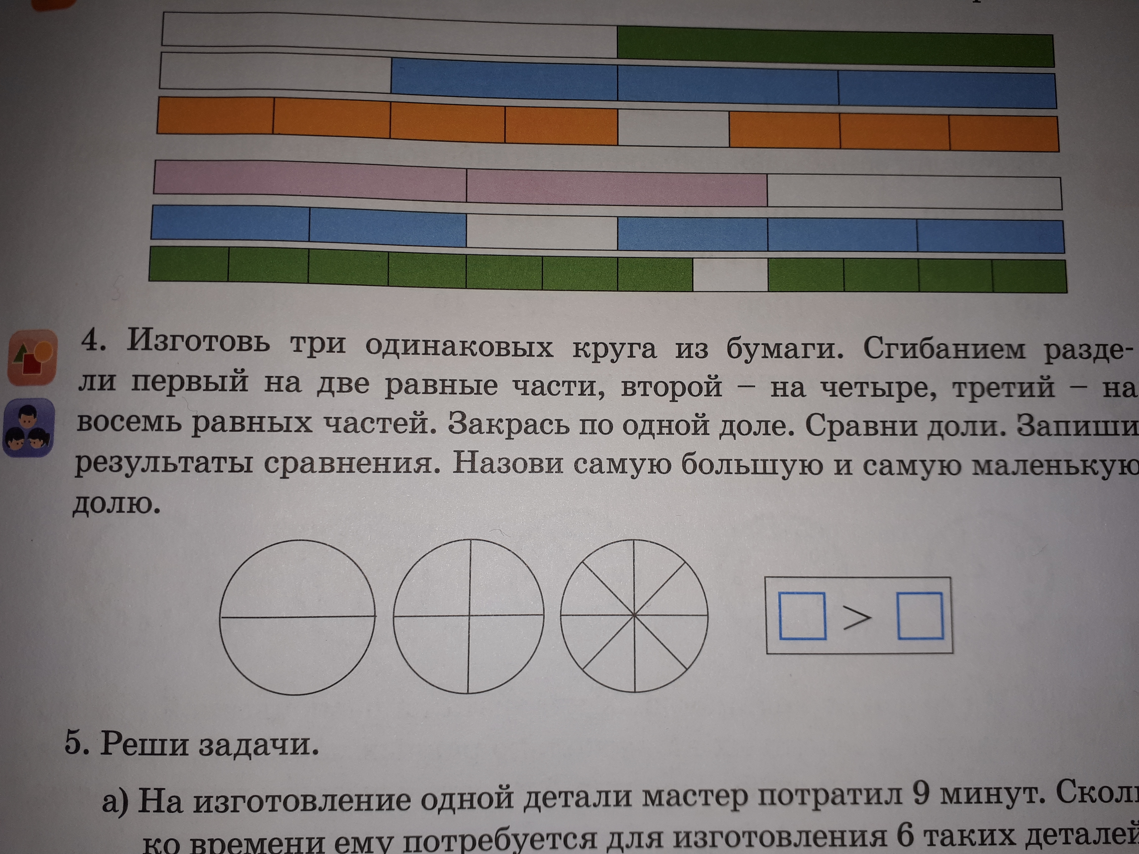 Изготовление три круга из бумаги.Сгибанием раздели первый на две равные части, второй-на четыре,третий-на восемь равных частей. Закрась по одной доле.Сравни доли. Запиши результаты сравнения.Назови самую большую и самую маленькую долю.