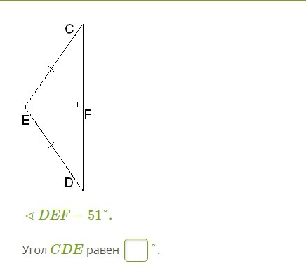 Трикутник DEC рівнобедрений тому висота EF є бісектрисою, тоді ∠DEF=∠CEF=51⁰, тоді ∠DEC=51⁰+51⁰=102⁰. Так як трикутник DEC рівнобедрений то ∠ECD=∠EDC сума кутів трикутника дорівнює 180⁰, тоді ∠ECD=∠EDC=⁽180°-102°⁾:2=39°