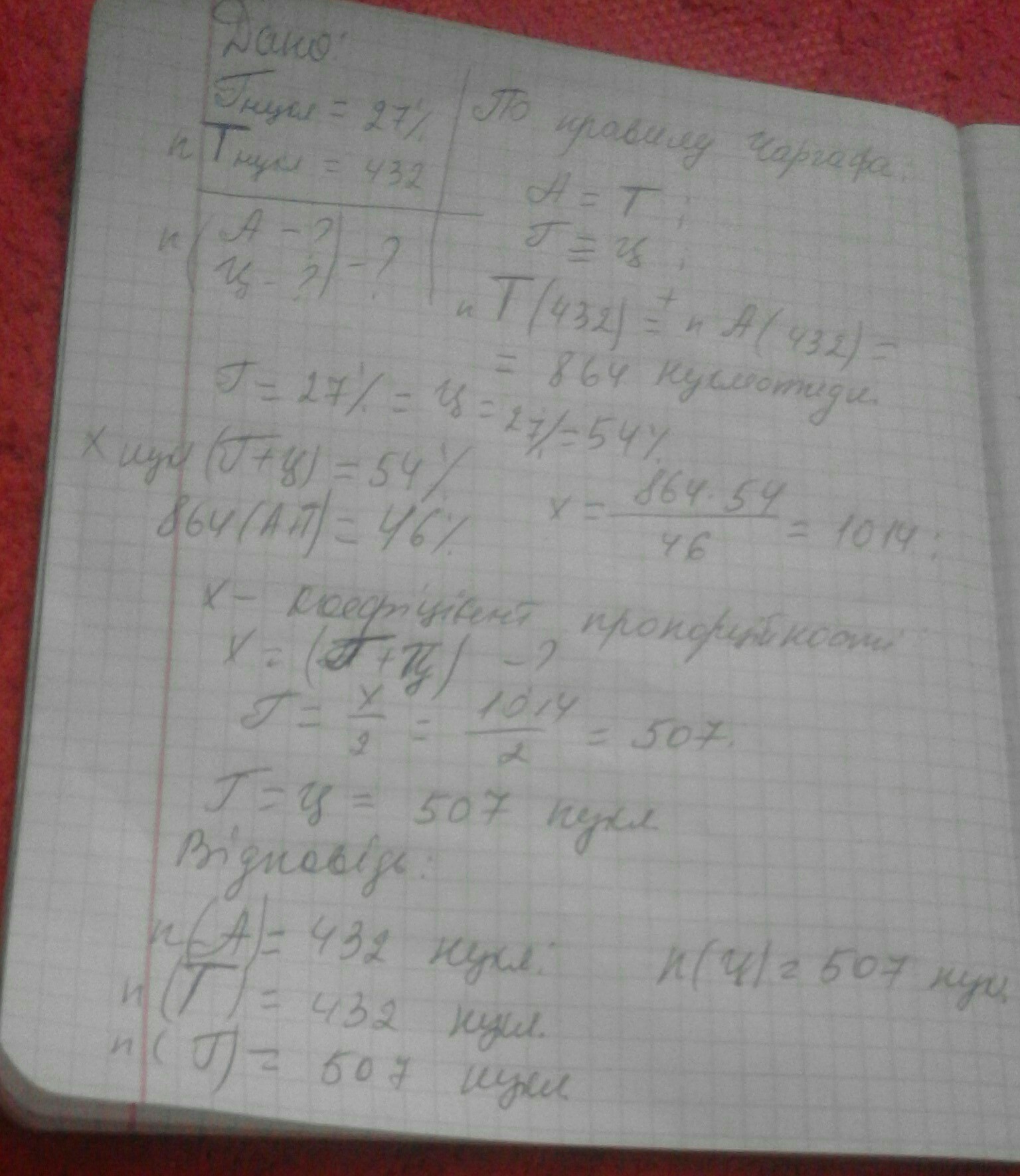Скільки залишків дезоксирибози міститься в молекулі ДНК, якщо в її складі 27 % гуанілових нуклеотидів, а тимідилових нуклеотидів — 432?