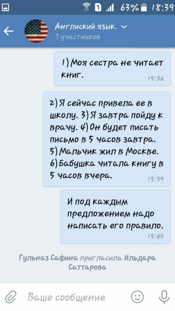 6. Grandmother was reading the book at 5 o'clock yesterday. (Past Continuous т.к. действие длилось в определенный момент в прошлом)