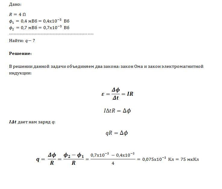 Магнитный поток через замкнутый проводник с электрическим сопротивлением 4 Ом равномерно увеличился с 0,4 мВб до 0,7 мВб. Какое количество заряда прошло через поперечное сечение проводника?