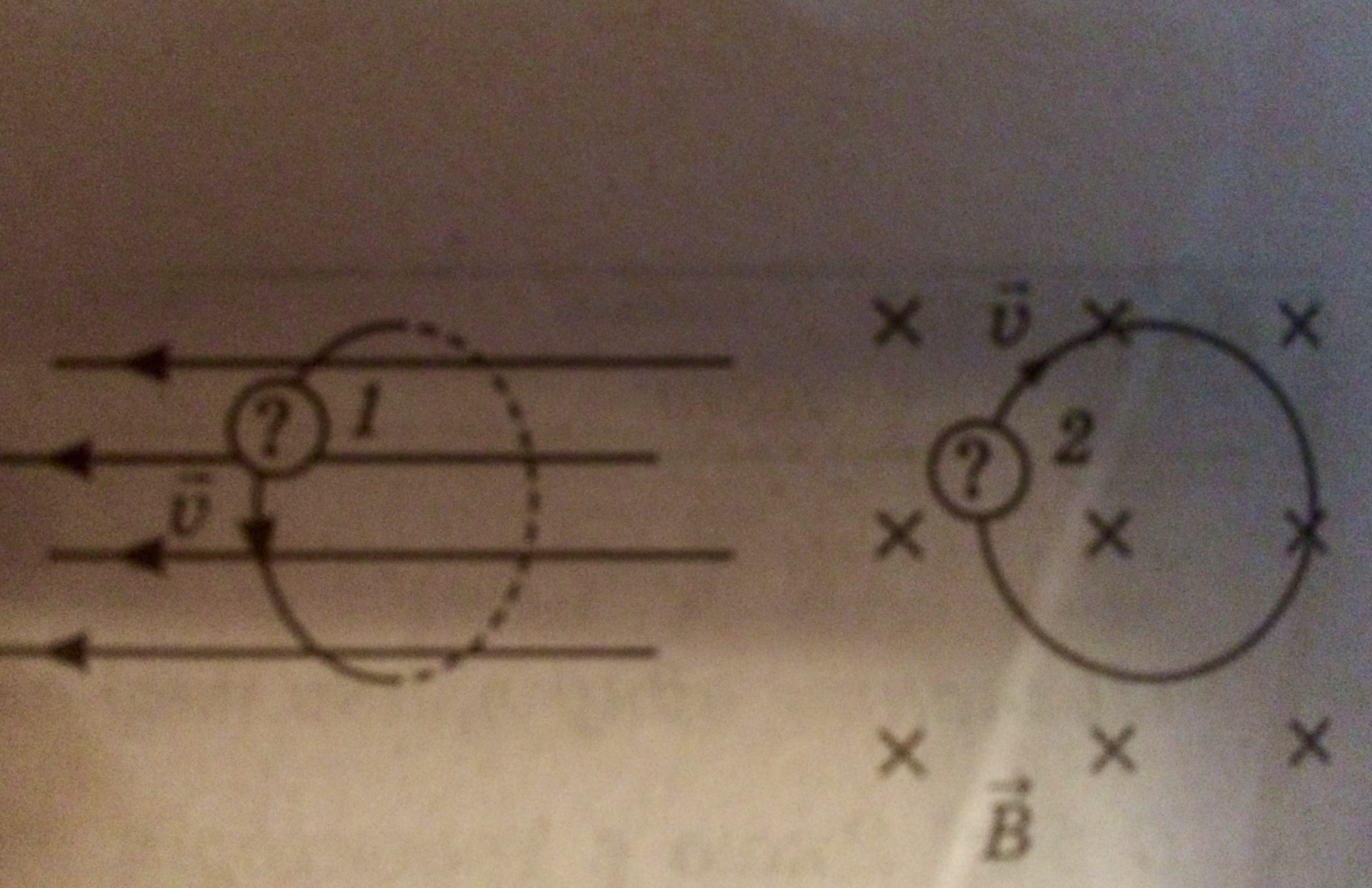 На рисунке изображена траектория движения заряженных частиц 1 и 2 в однородных магнитных полях. Какие знаки зарядов у частиц и почему?