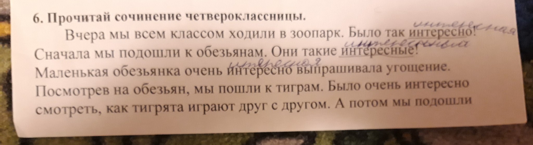 Вчера мы всем классом ходили в зоопарк. Было так интересно! Сначала мы подошли к обезьянам. Они такие забавные! Маленькая обезьянка очень любопытно выпрашивала угощение. Посмотрев на обезьян, мы пошли к тиграм. Было очень увлекательно смотреть, как тигрята играют друг с другом. А потом мы подошли к бегемоту. Он такой большой. А ещё мы видели животное с редким названием: изюбрь. Этот день в зоопарке был прекрасным.
