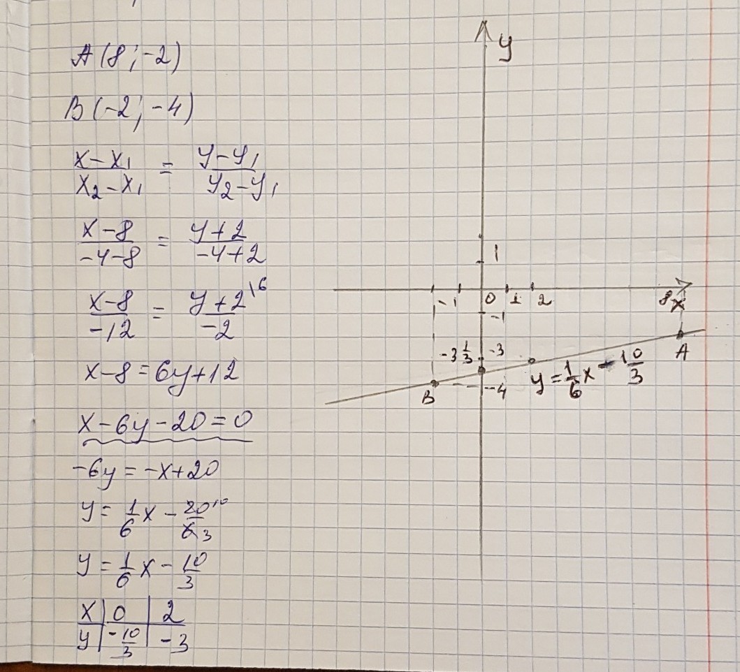 Написать уравнение прямой,проходящей через точки А(8;-2) и В(-2;-4) построить её