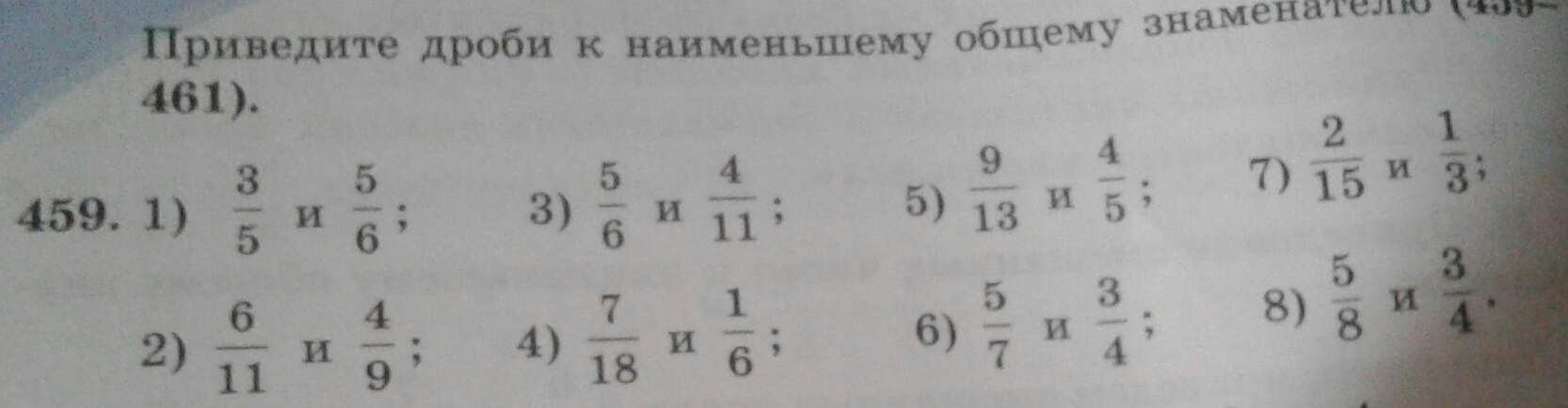 1) 18/30 и 25/30; 2) 54/99 и 44/99 3) 55/66 и 24/66; 4) 7/18 и 3/18; 5) 45/65 и 52/65; 6) 20/28 и 21/28; 7) 2/15 и 5/15; 8) 10/16 и 12/16
