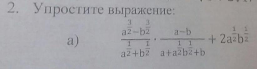 frac{a^{3/2}-b^{3/2}}{a^{1/2}+b^{1/2}} *frac{a-b}{a+a^{1/2}b^{1/2}+b} +2a^{1/2}b^{1/2}=\ \ frac{(a^{1/2}-b^{1/2})(a+a^{1/2}b^{1/2}+b)(a^{1/2}-b^{1/2})(a^{1/2}+b^{1/2})}{(a^{1/2}+b^{1/2})(a+a^{1/2}b^{1/2}+b)} +2a^{1/2}b^{1/2}=\ \(a^{1/2}-b^{1/2})^2+2a^{1/2}b^{1/2}=\ \a-2a^{1/2}b^{1/2}+b+2a^{1/2}b^{1/2}=a+b\ \