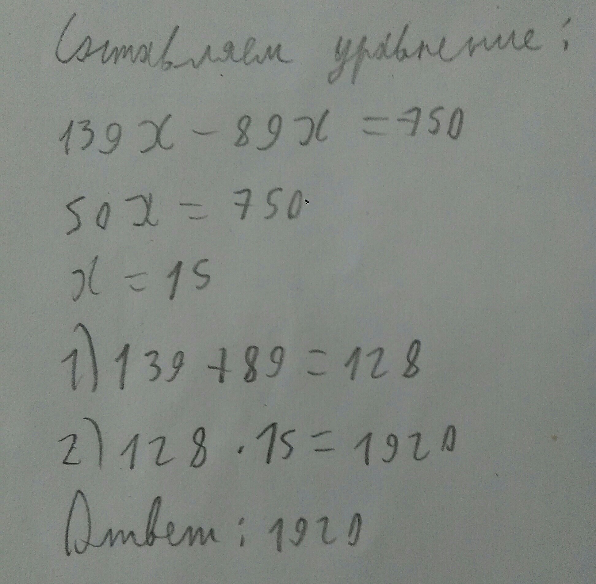 Пусть х - цена 139x-89x=750 50x=750 x=15 грн 139+89= 128 всего продано билетов 128*15=1920 грн