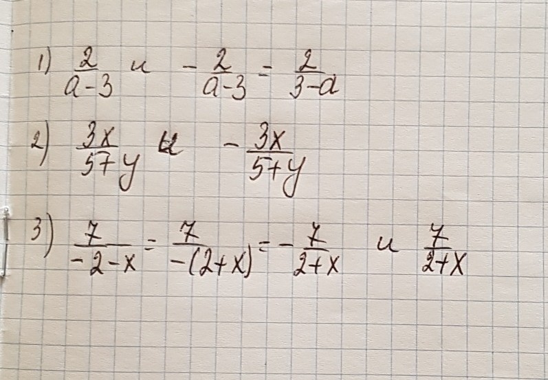 Для данных дробей напишите дроби, им противоположные: 2/a-3, 3x/5+y , 7/-2-x