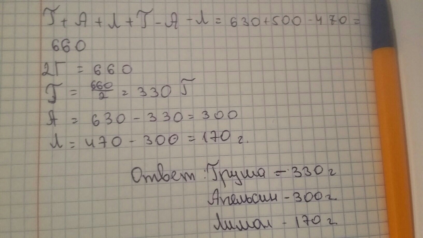 Груша и апельсин вместе весят 630г апельсин и лимон вместе весят 470г лимон и груша вместе весят 500г.Сколько весят апельсин, груша, лимон