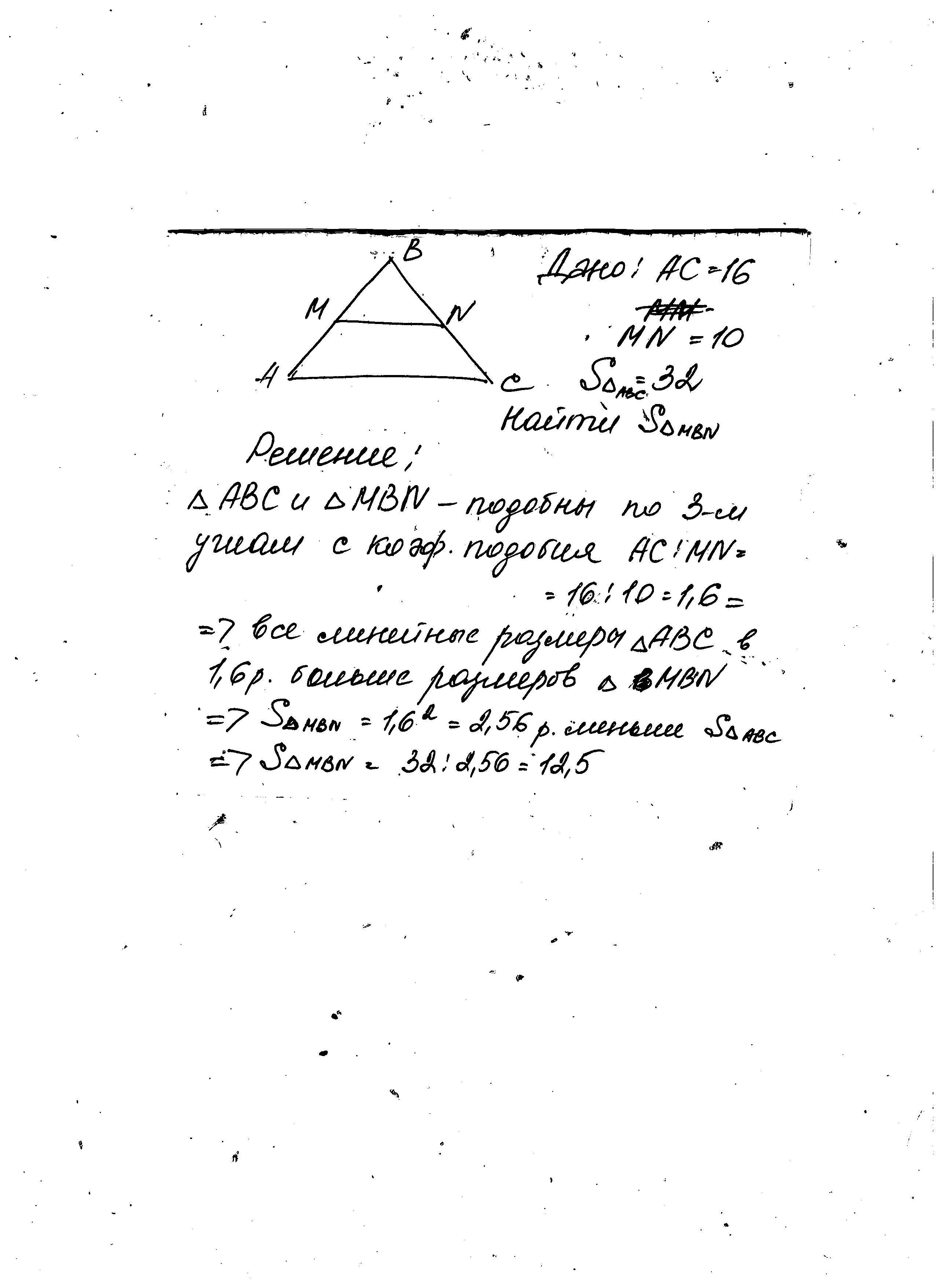 Прямая, параллельная стороне AC треугольника ABC, пересекает стороны AB и BC в точках M и N соответственно AC=16, MN=10. Площадь треугольника ABC равно 32. Найди площадь треугольника MBN.
