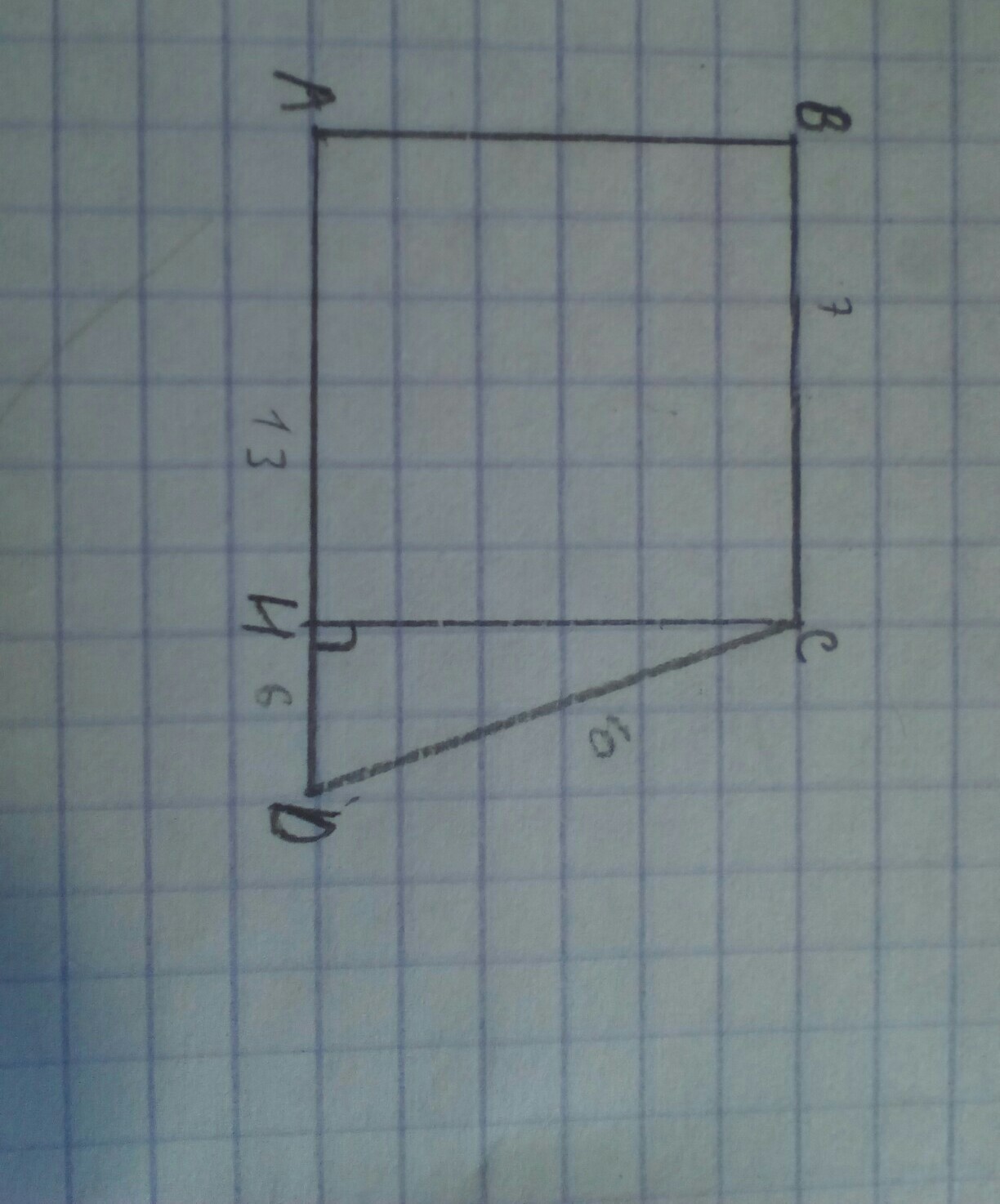 В прямоугольной трапеции ABCD боковая сторона AB перпендикулярна основанию Найдите AB если CD= 10 BC=7 AD=13