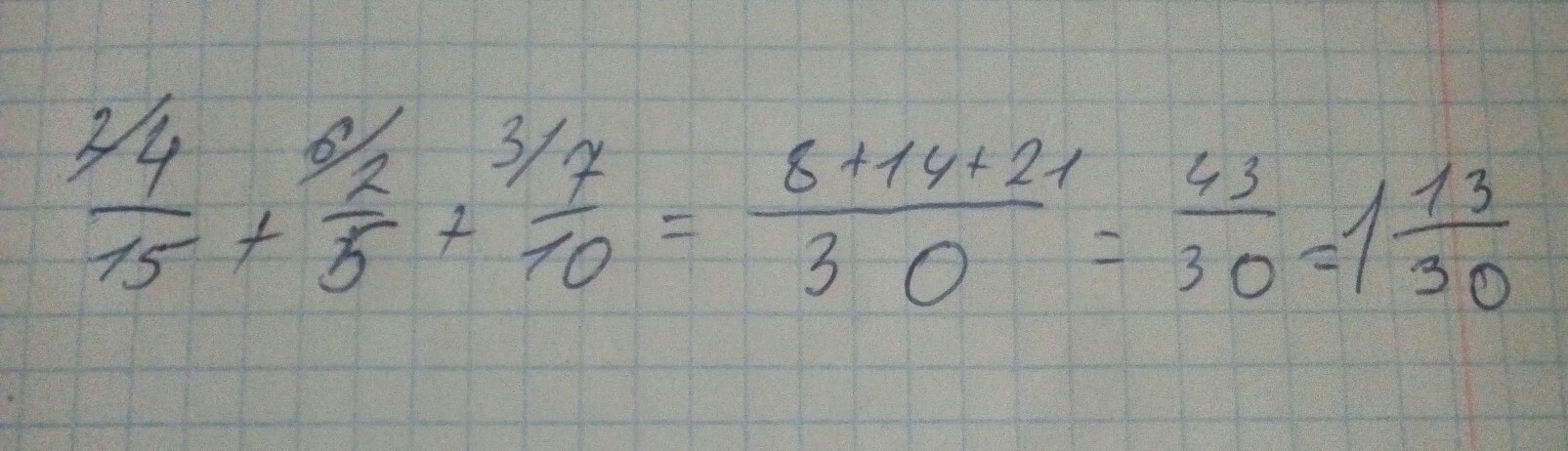 4/15+2/5+7/10=0,3+0,4+0,7=1,4;