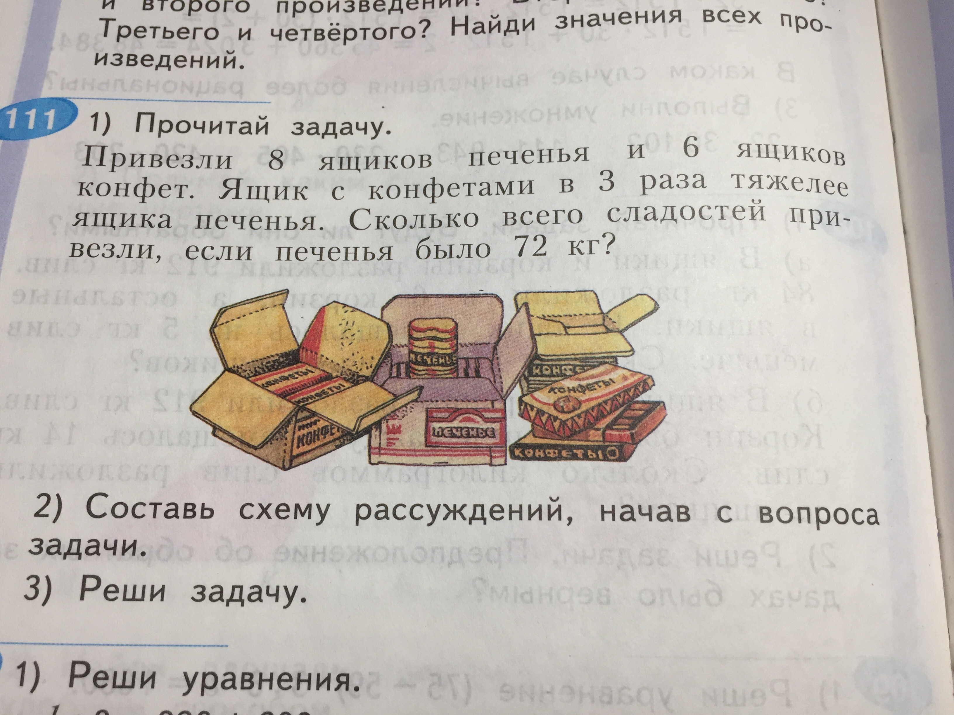 Ящик с конфетами в 3 раза тяжелее, чем ящик с печеньем, то есть: