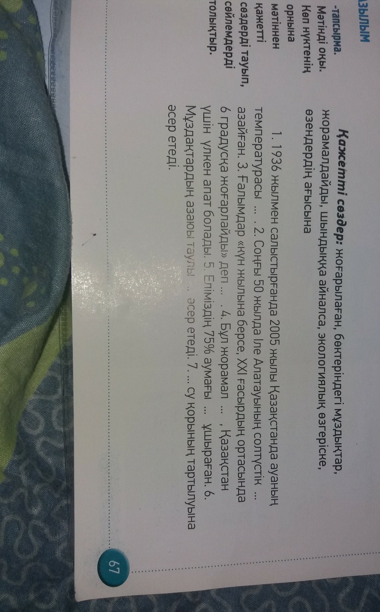 1)1936 жылмен салыстырғанда 2005 жылы Қазақстанда ауаның температурасы ЖОҒАРЫЛАҒАН.2)Соңғы 50 жылда Іле Алатауының солтүстік БӨКТЕРІНДЕГІ МҰЗДЫҚТАР азайған.3)Ғалымдар "күн жылына берсе,21 ғасырдың ортасында 6 градусқа жоғарылайды" деп ЖОРАМАЛДАЙДЫ.4)Бұл жорамал ШЫНДЫҚҚА АЙНАЛСА,Қазақстан үшін үлкен апат болады.5)Еліміздің 75% аумағы ЭКОЛОГИЯЛЫҚ ӨЗГЕРІСКЕ ұшыраған.6)Мұздықтардың азаюы таулы ӨЗЕНДЕРДІҢ АҒЫСЫНА әсер етеді.7)КҮННІҢ ЖЫЛЫНУЫ су қорының тартылуына әсер етеді.