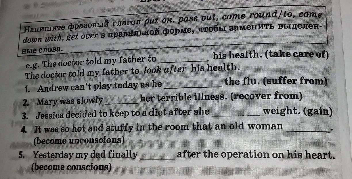 1 has come down with 2 getting over 3 had put on 4 passed out 5 came round