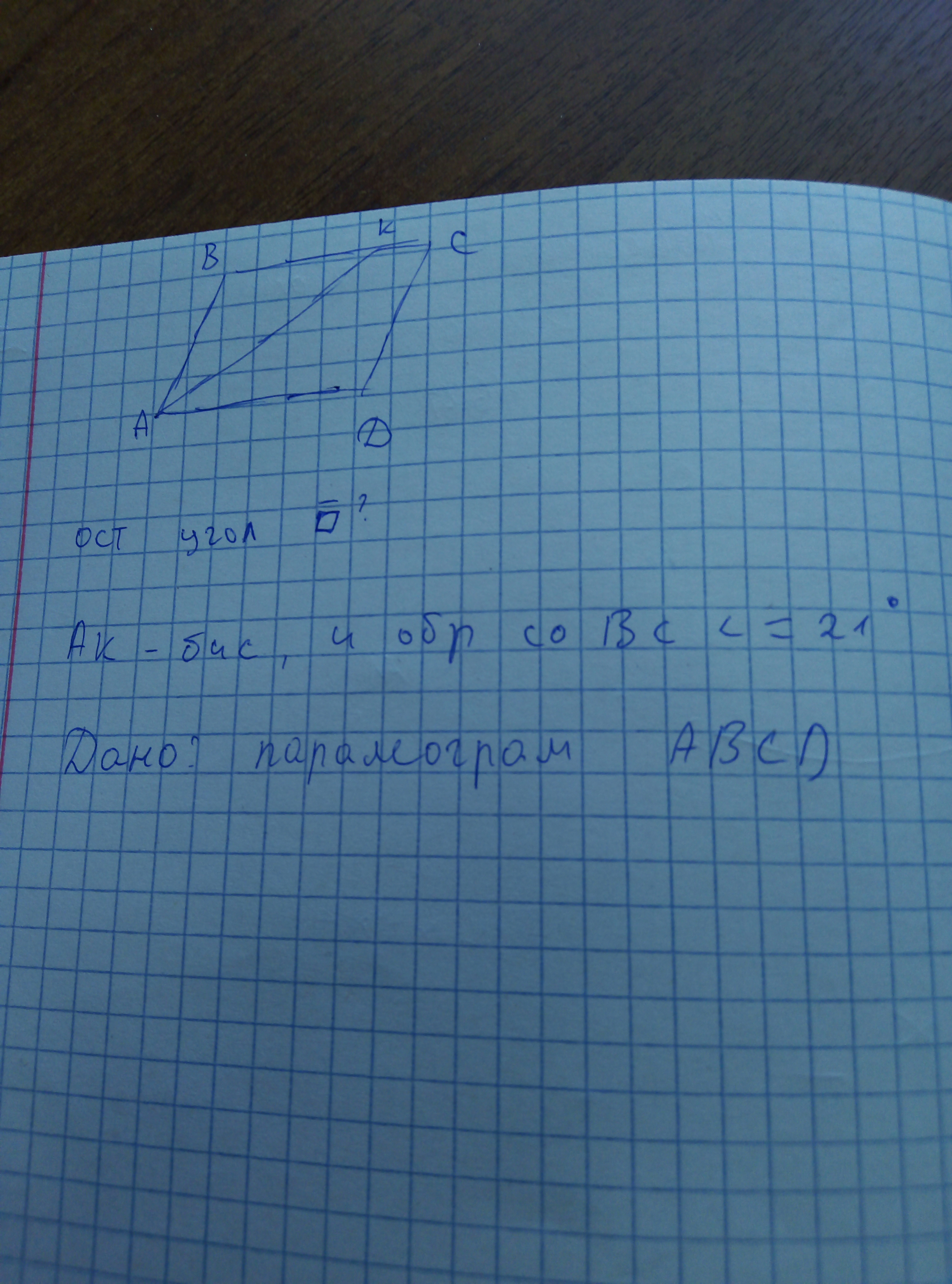 ВС параллельна АД, АК- секущая, из всего этого следует, что угол ВКА= углу КАД и равен 21 градус