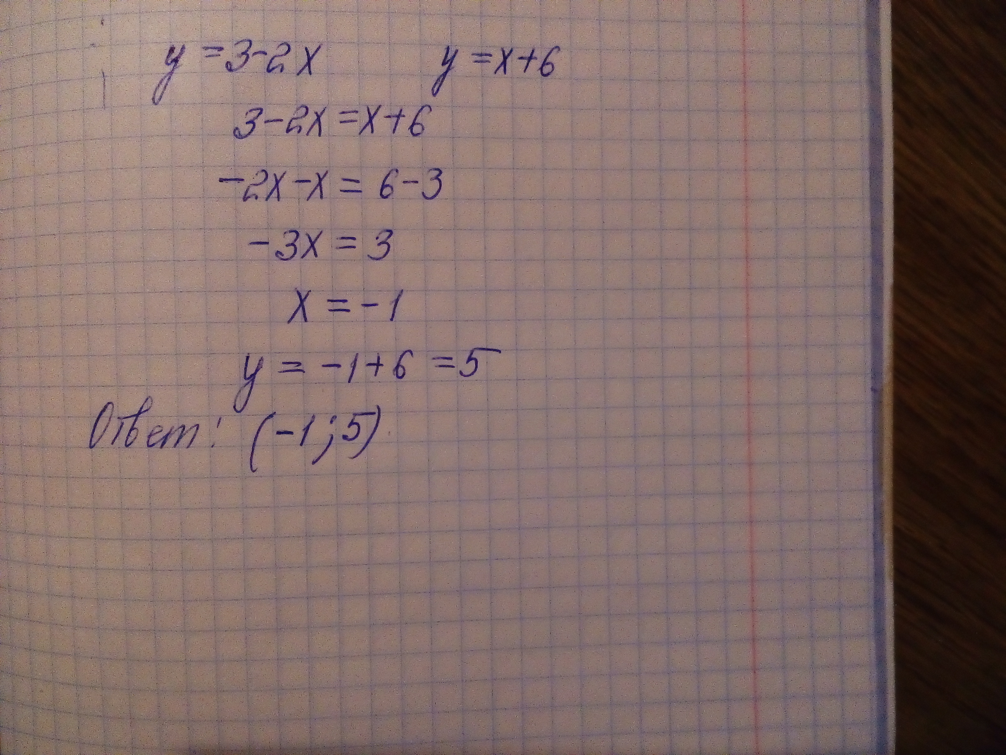 Найдите координаты точки пересечения графиков функций y = 3 - 2x и y = x + 6.
